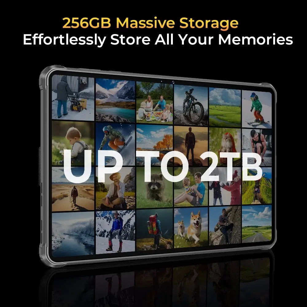 The RT8 rugged tablet keeps things running smoothly and efficiently with 6GB of base memory, expandable up to 12GB. It also has 256GB of built-in internal storage for storing your songs, photos, files, applications and media collection. You can also use a storage card to expand the ROM by up to 2TB.